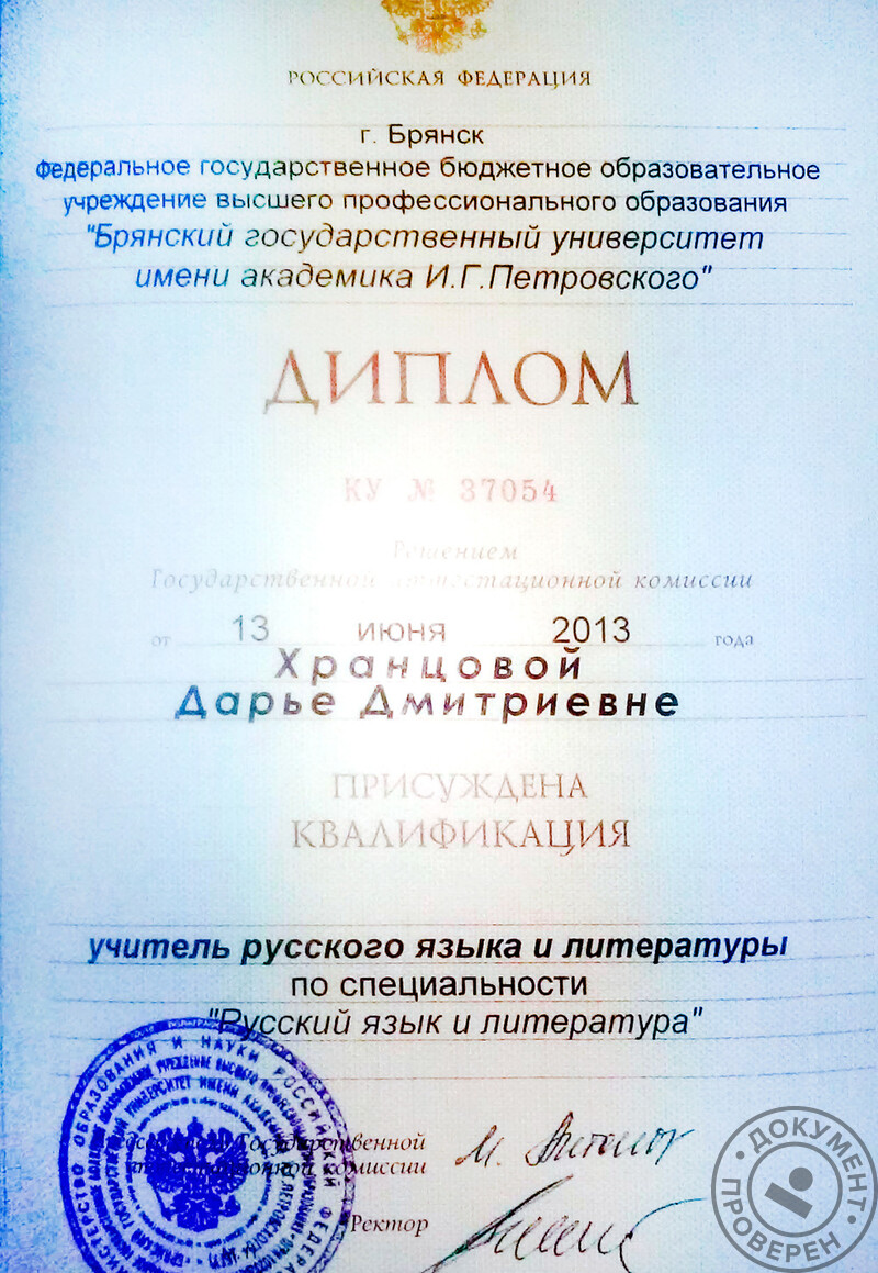 - Окончила БГУ им. академика И.Г. Петровского, филологический факультет, специальность – учитель русского языка и литературы (2013 г.).