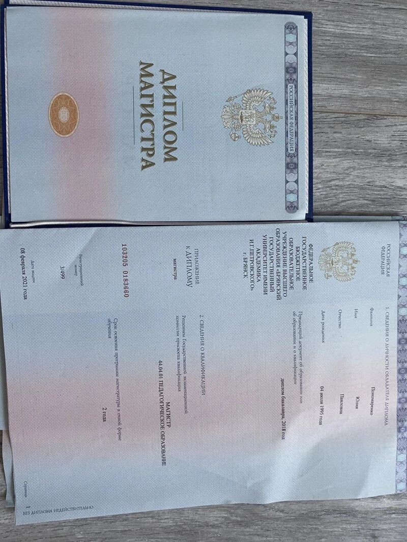 - Брянский государственный университет имени академика И. Г. Петровского, педагогическое образование, магистр, 2018–2021 гг.
