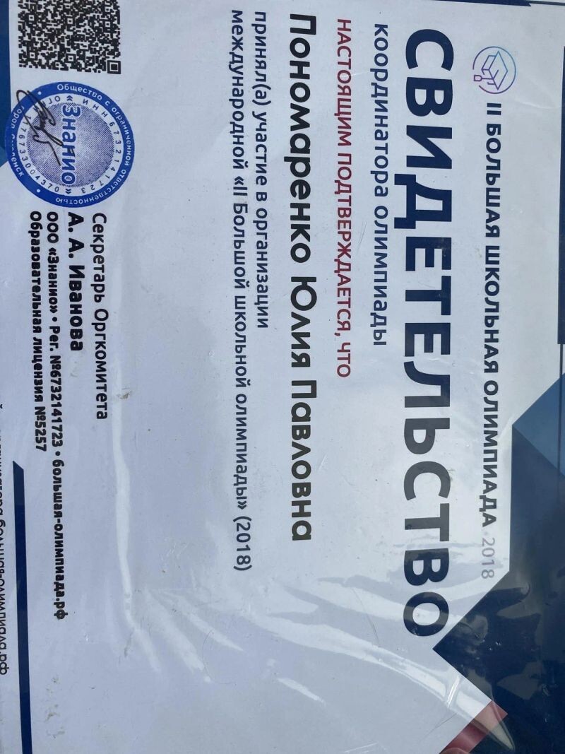 - ООО «Знанио», 2 большая школьная олимпиада, участник организации, 2018 г.
