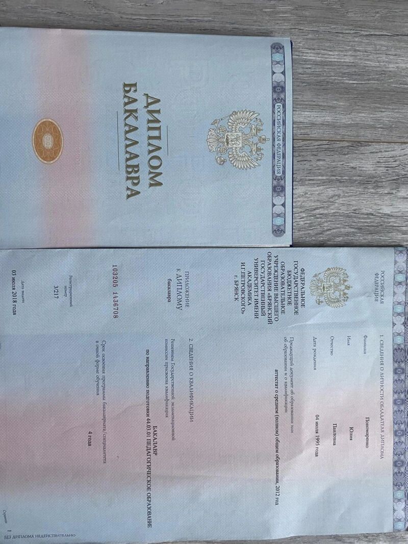 - Брянский государственный университет имени академика И. Г. Петровского, педагогическое образование, бакалавр, 2012–2018 гг.