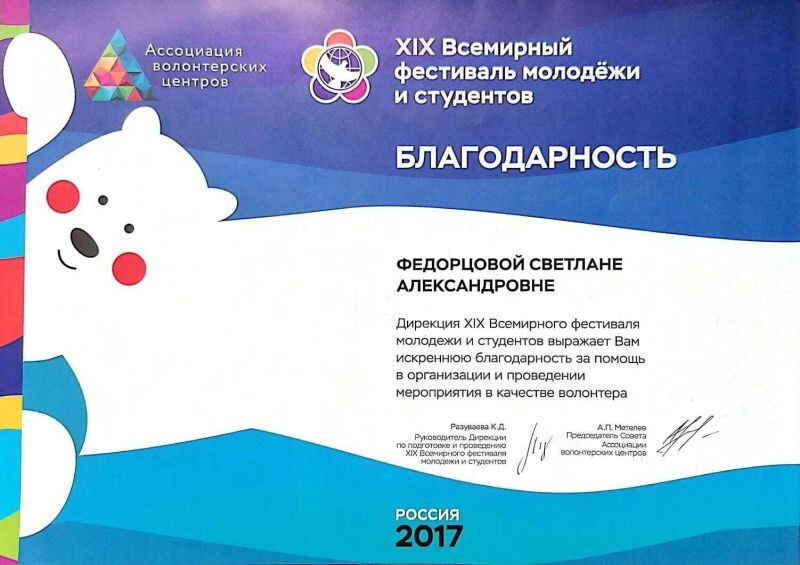 - Ассоциация волонтёрских центров, благодарность за помощь в организации и проведении мероприятия в качестве волонтёра, 2017 г.