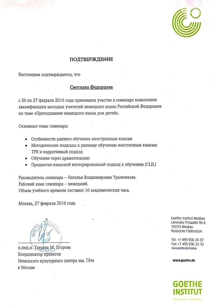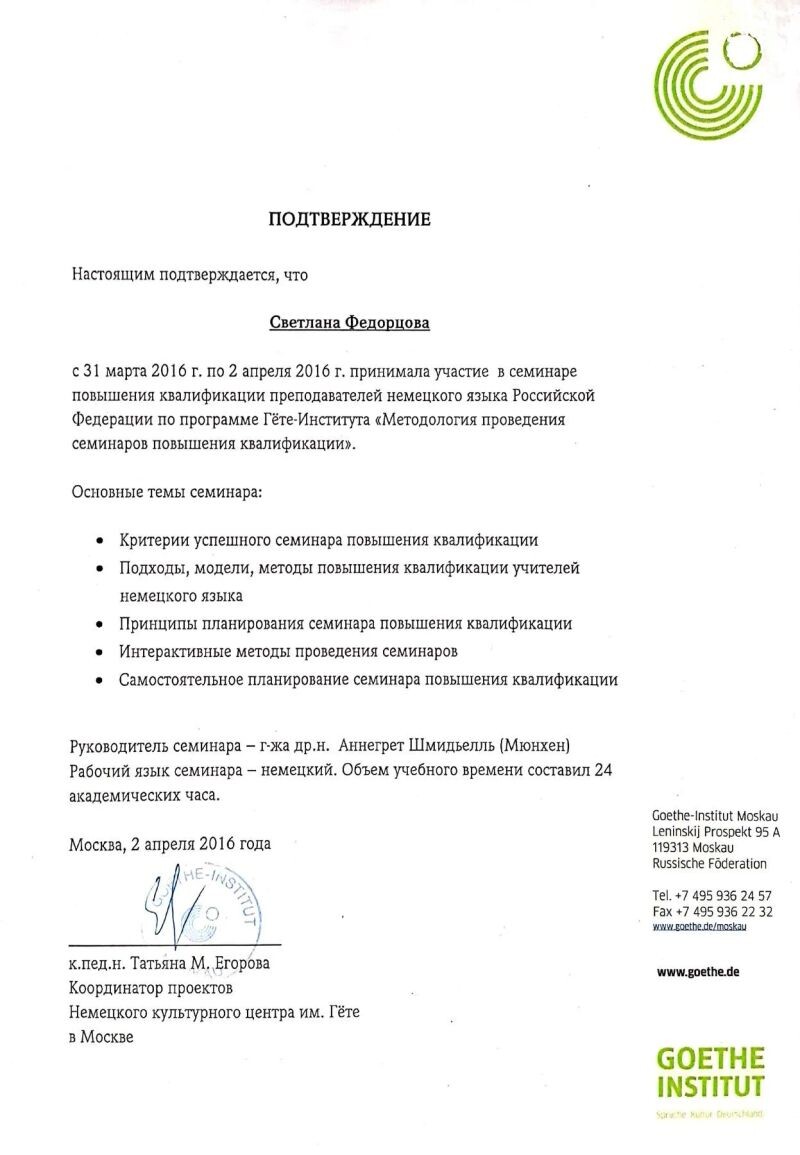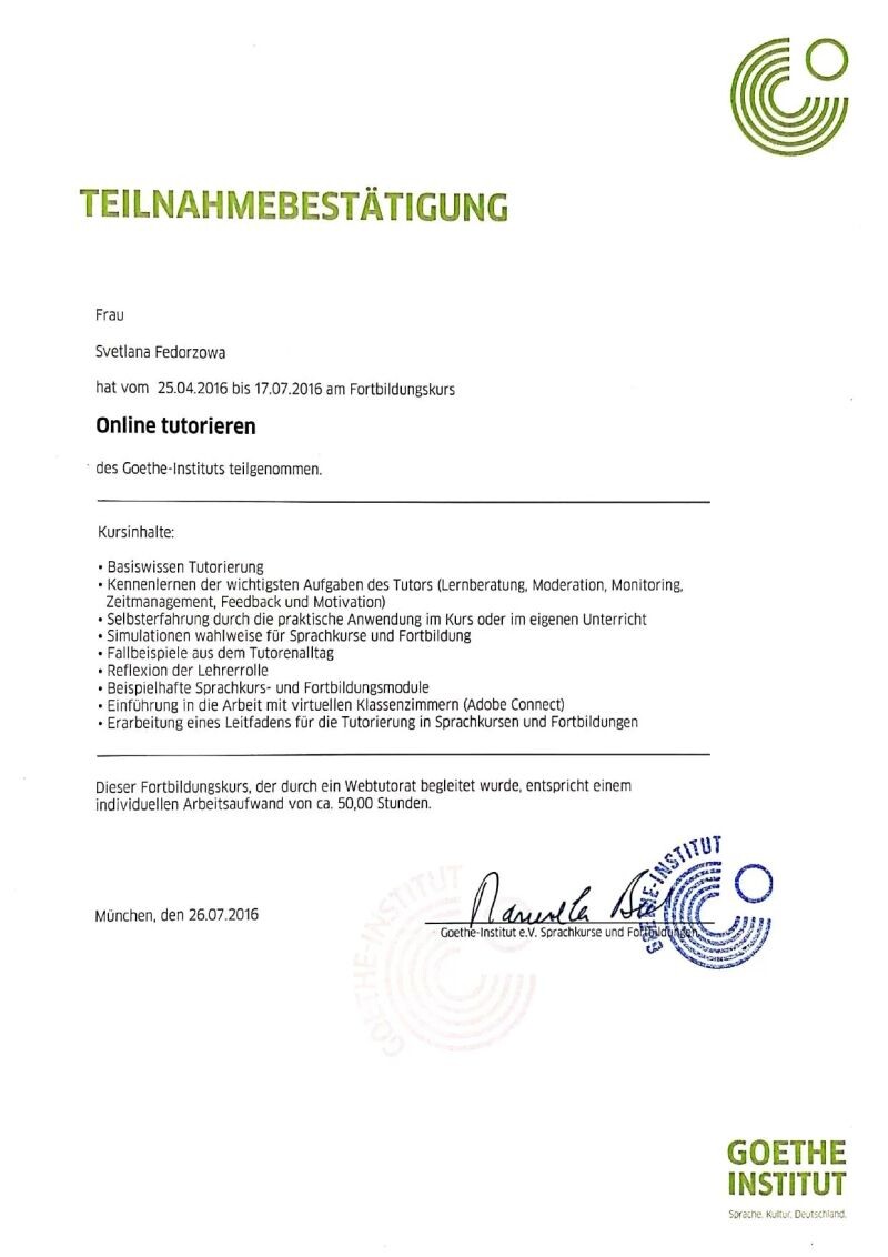 - Гёте-Институт, семинар повышения квалификации преподавателей немецкого языка Российской Федерации по программе Гёте-Института «Методология проведения семинаров повышения квалификации», 2016 г.