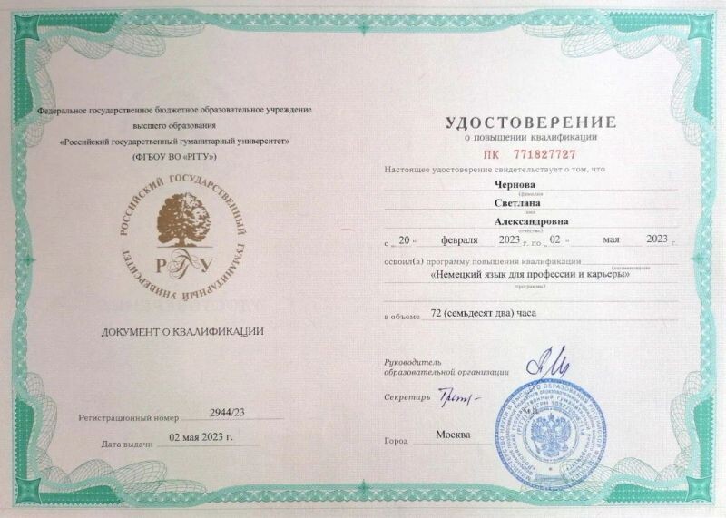- Российский государственный гуманитарный университет, немецкий язык для профессии и карьеры, 2023 г.