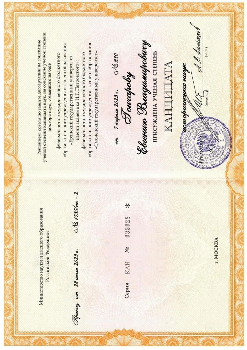 - Брянский государственный университет имени академика И. Г. Петровского, кандидат исторических наук, 2023 г.
