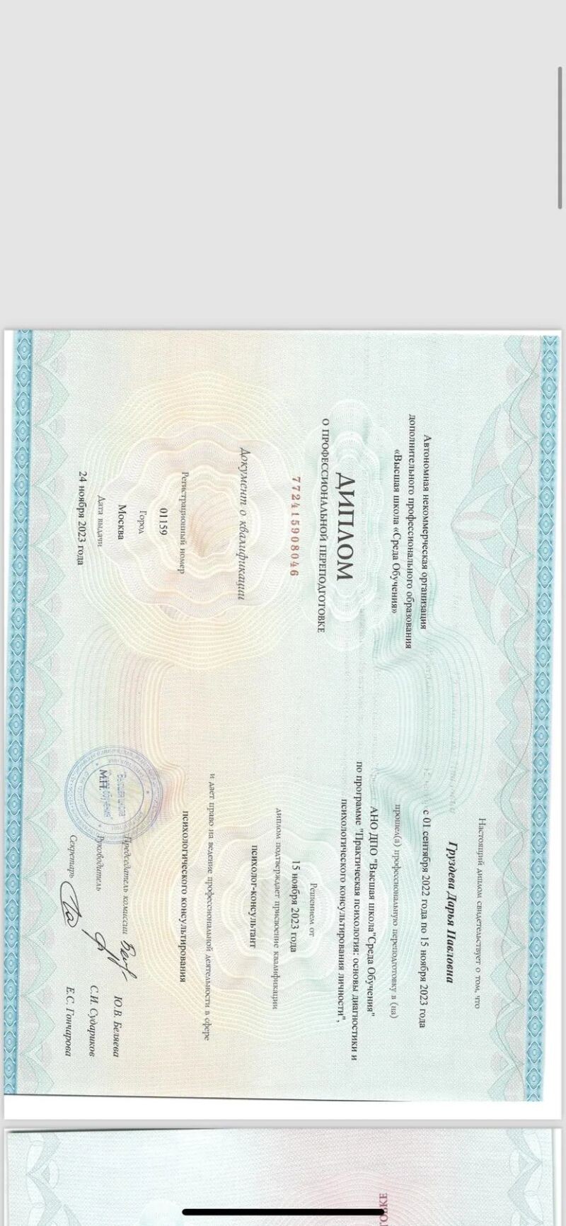 - АНО ДПО «Высшая школа „Среда обучения“», профессиональная переподготовка по программе «Практическая психология: основы диагностики и психологического консультирования личности», квалификация — психолог-консультант, 2022–2023 гг.