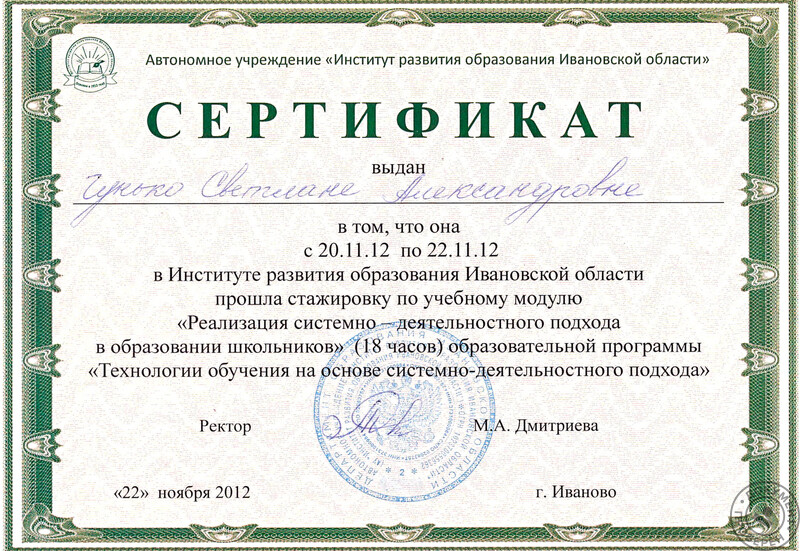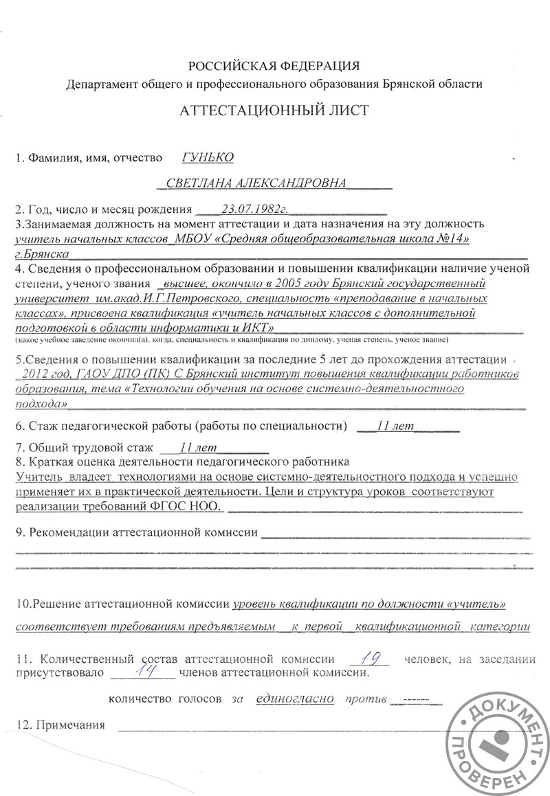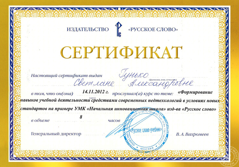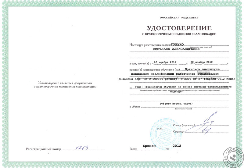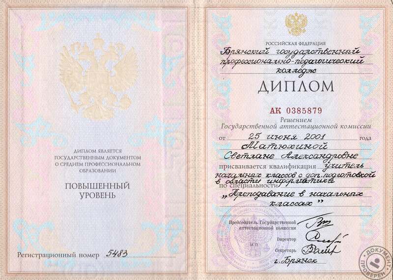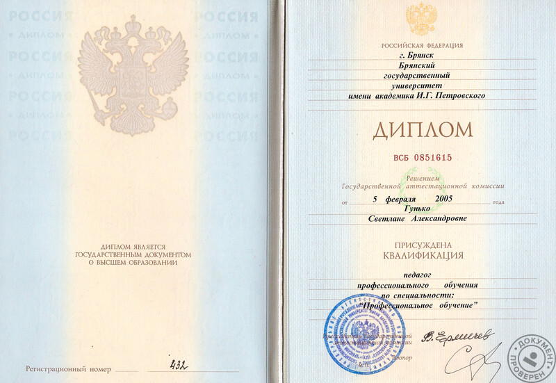 - Окончила Брянский государственный профессионально-педагогический колледж, квалификация – учитель начальных классов с дополнительной подготовкой в области информатики, 2001 г.