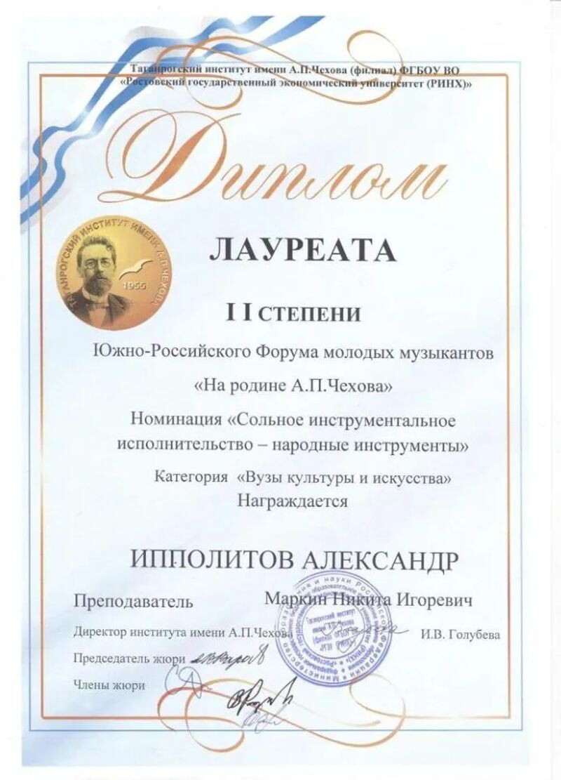 - РИНХ, диплом лауреата второй степени Южно-Российского форума молодых музыкантов «На родине А.П. Чехова», номинация «Сольное инструментальное исполнительство — народные инструменты», 2019 г.
