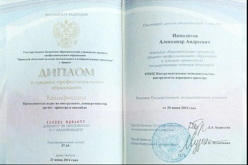 - Брянский областной колледж музыкального и изобразительного искусства, инструментальное исполнительство, инструменты народного оркестра, 2014 г.