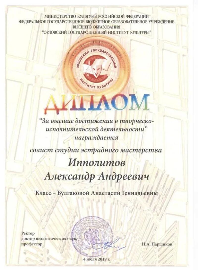 - Орловский государственный институт культуры, диплом за высшие достижения в творческо-исполнительской деятельнсти, 2019 г.