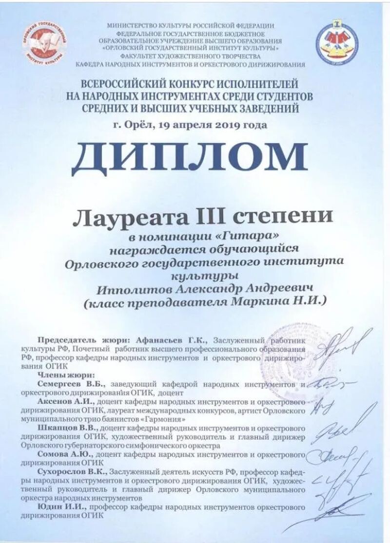 - Орловский государственный институт культуры, Всероссийский конкурс исполнителей на народных инструментах среди студентов средних и высших учебных заведений г. Орёл, лауреат третьей степени в номинации «Гитара», 2019 г.