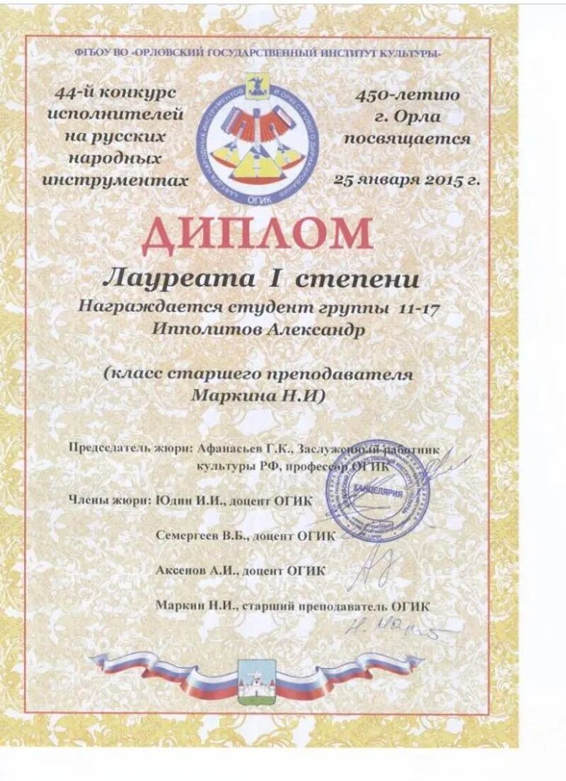 - Орловский государственный институт культуры, 44-й конкурс исполнителей на русских народных инструментах, лауреат первой степени, 2015 г.