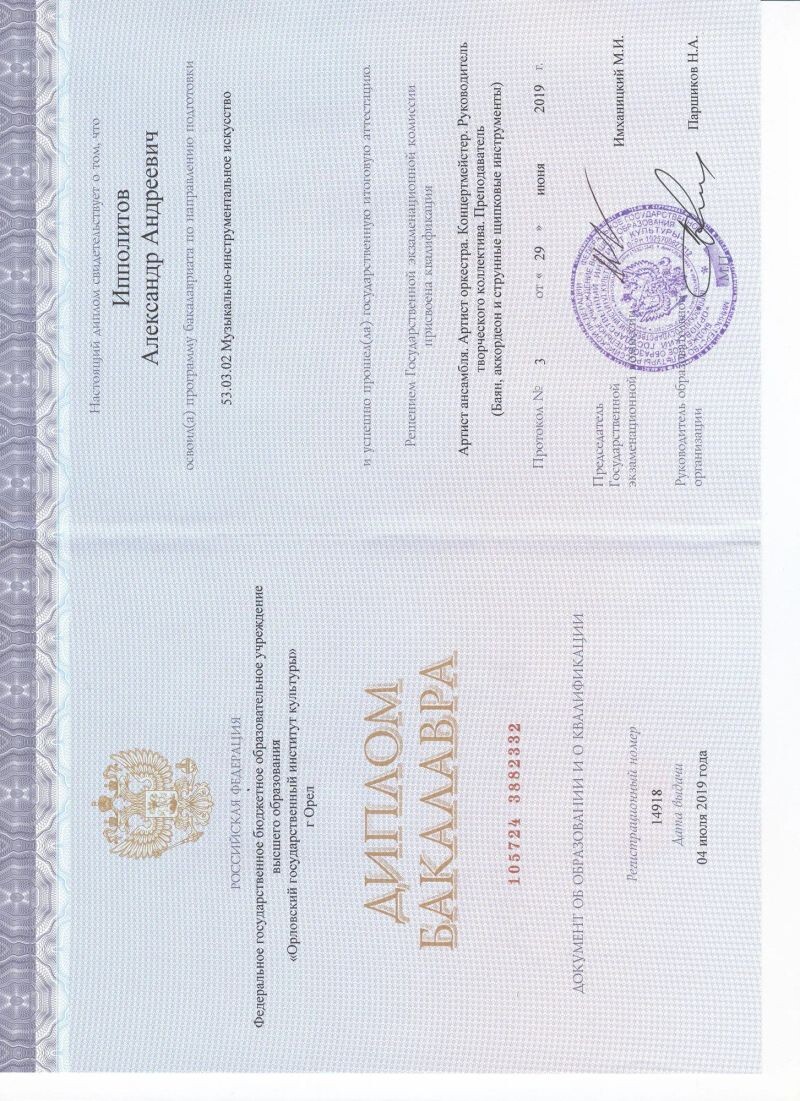 - Орловский государственный института культуры, музыкально-инструментальное искусство, артист, артист оркестра, концертмейстер, руководитель творческого коллектива, преподаватель (баян, аккордеон и струнные щипковые инструменты), 2015–2019 гг.