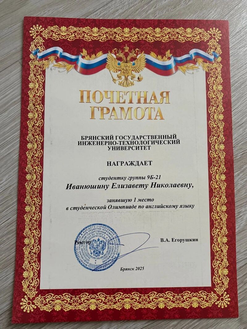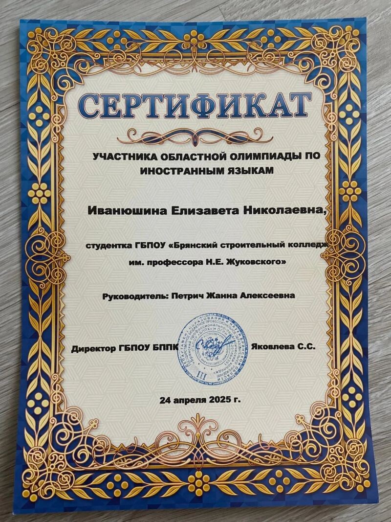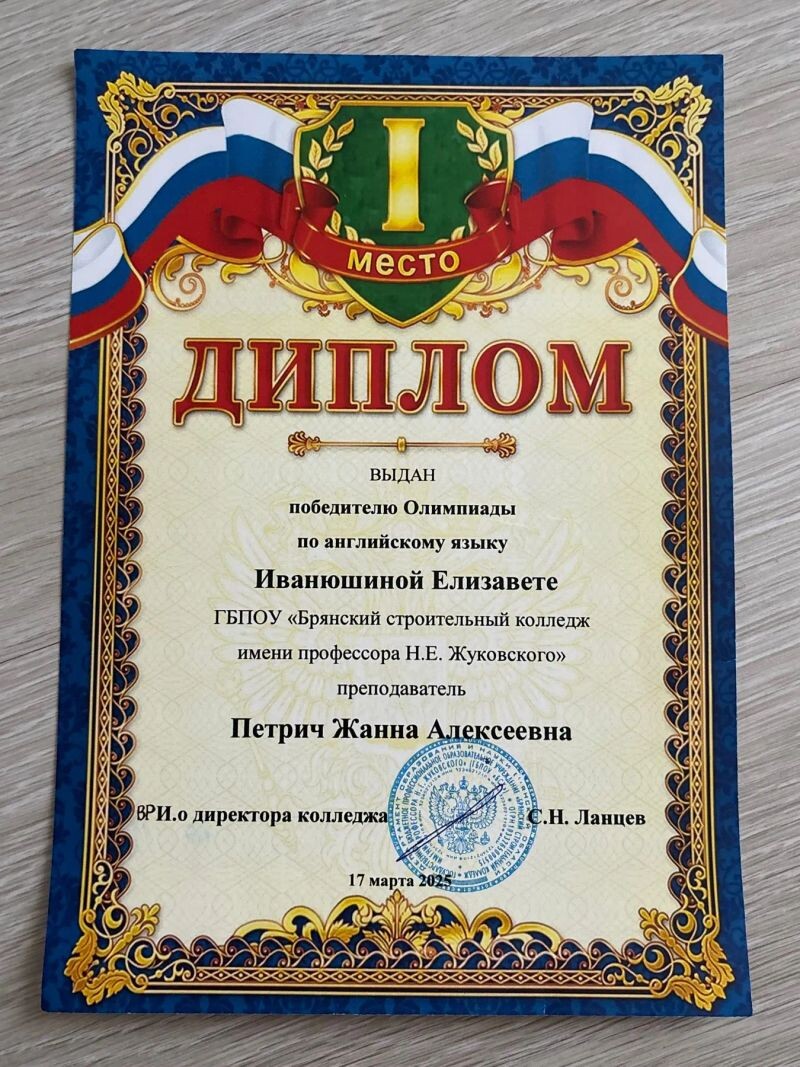 - Олимпиада по Английскому языку,Брянский строительный колледж (с 2025 г.).