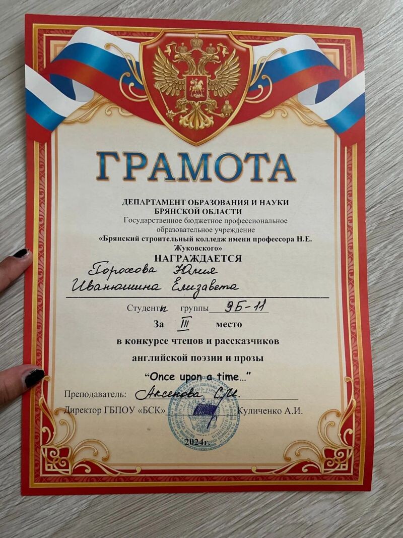 - Областная олимпиада по Английскому языку,3 место,Брянский профессионально-педагогический колледж (с 2025 г.).