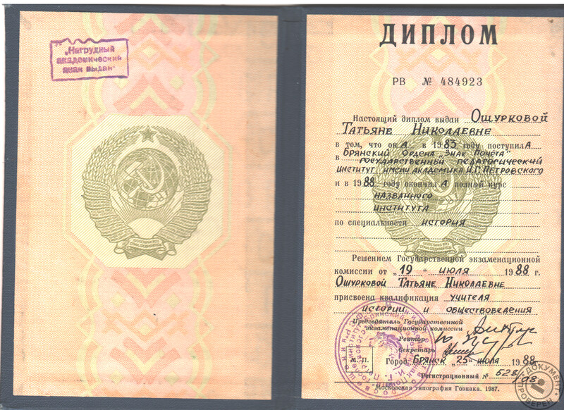 - Брянский государственный педагогический институт, исторический факультет, учитель истории и обществоведения, 1983–1988 гг.