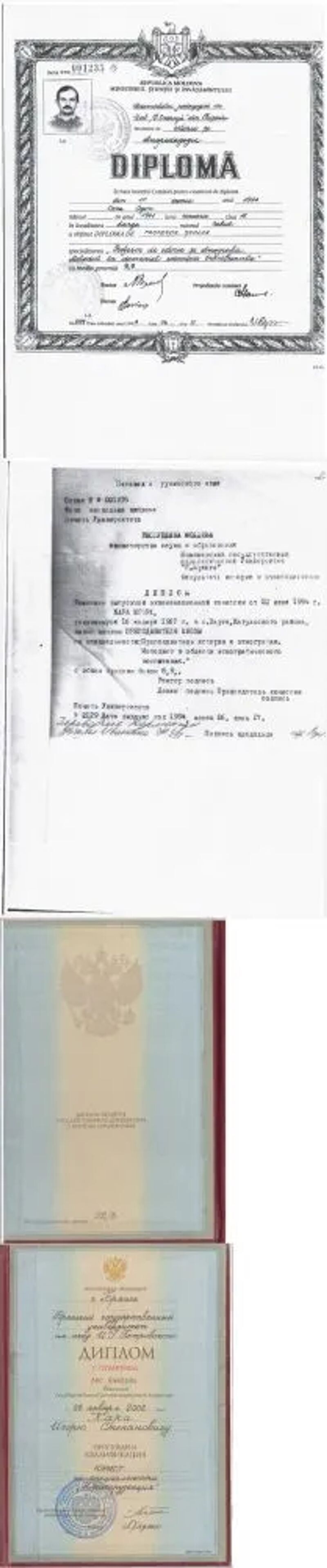 - Кишиневский государственный педагогический университет им. И. Крянгэ, факультет истории и этнопедагогики, преподаватель истории и этнографии, 1989–1994 гг.