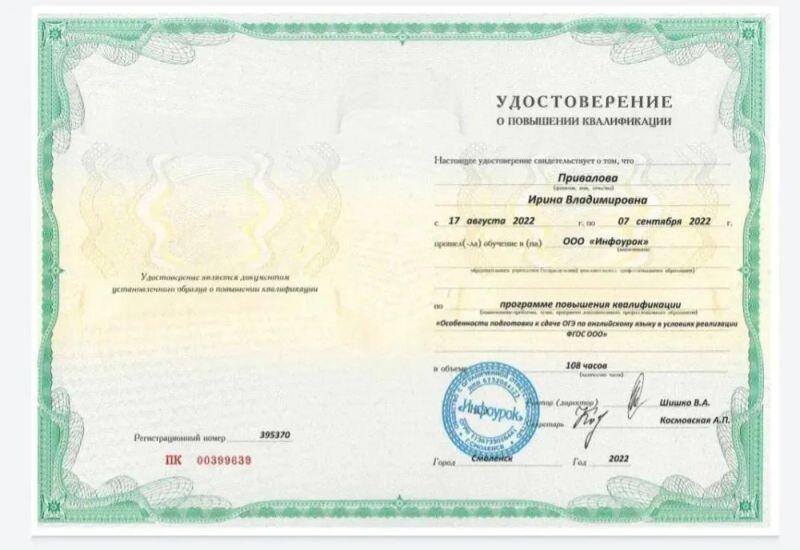 - ООО «Инфоурок», курсы повышения квалификации «Особенности подготовки к сдаче ОГЭ по английскому языку в условиях реализации ФГОС ООО», 2022 г.