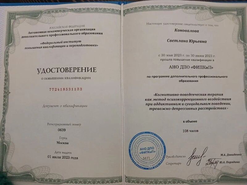 - Федеральный институт повышения квалификаций и переподготовки, программа «Когнитивно-поведенческая терапия как метод психокоррекционного воздействия при аддиктивном и суицидальном поведении, тревожно-депрессивных расстройствах», 2023 г.