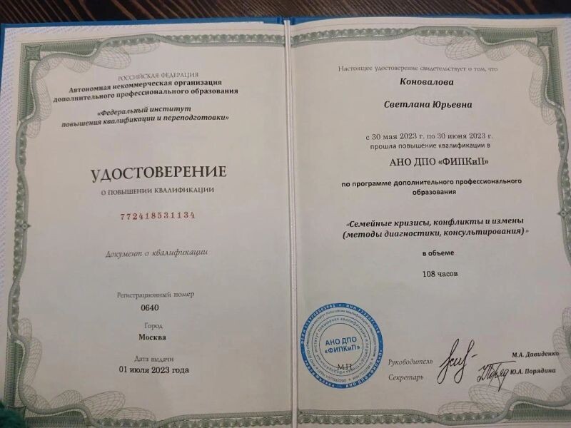 - Федеральный институт повышения квалификаций и переподготовки, программа «Семейные кризисы, конфликты и измены (методы диагностики, консультирования)», 2023 г.