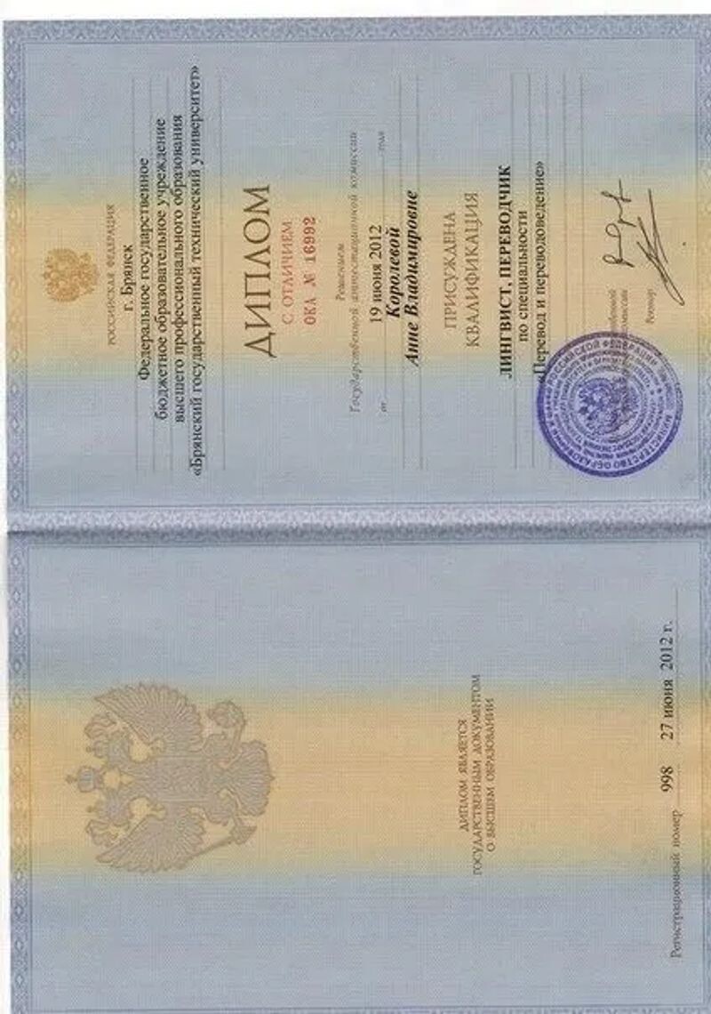 - Брянский государственный технический университет, перевод и переводоведение, переводчик-лингвист, 2007–2012 гг.