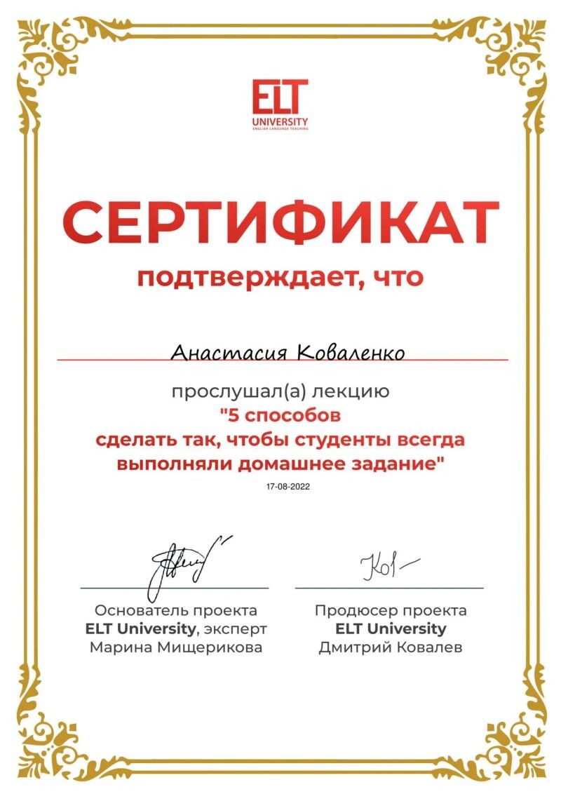 - ELT University, лекция «5 способов сделать так, чтобы студенты всегда выполняли домашнее задание», 2022 г.