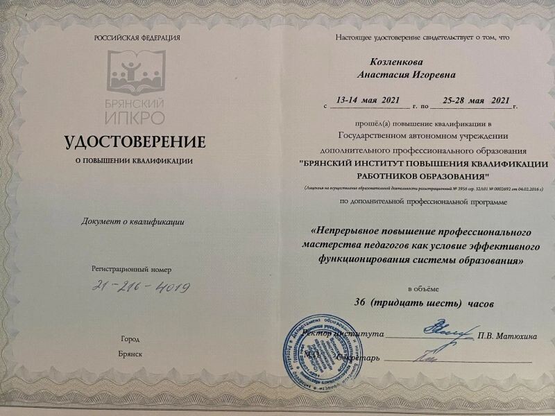- Брянский институт повышения квалификации работников образования, непрерывное повышение профессионального мастерства педагогов как условие эффективного функционирования системы образования, 2021 г.