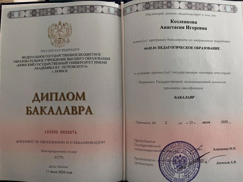 - Брянский государственный университет имени академика И.Г. Петровского, педагогическое образование, бакалавр, 2016–2020 гг.
