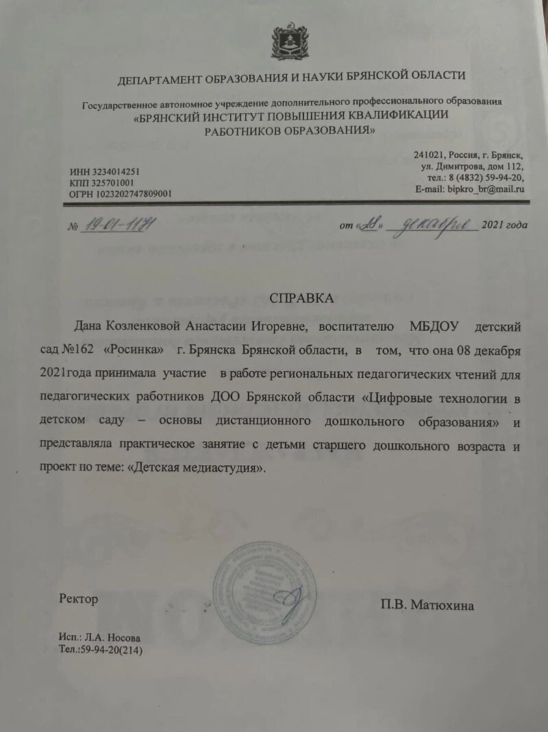 - Региональные педагогические чтения для педагогических работников ДОО Брянской области «Цифровые технологии в детском саду — основа дистанционного дошкольного образования», предоставление практического занятия с детьми старшего дошкольного возраста, 2021 г.