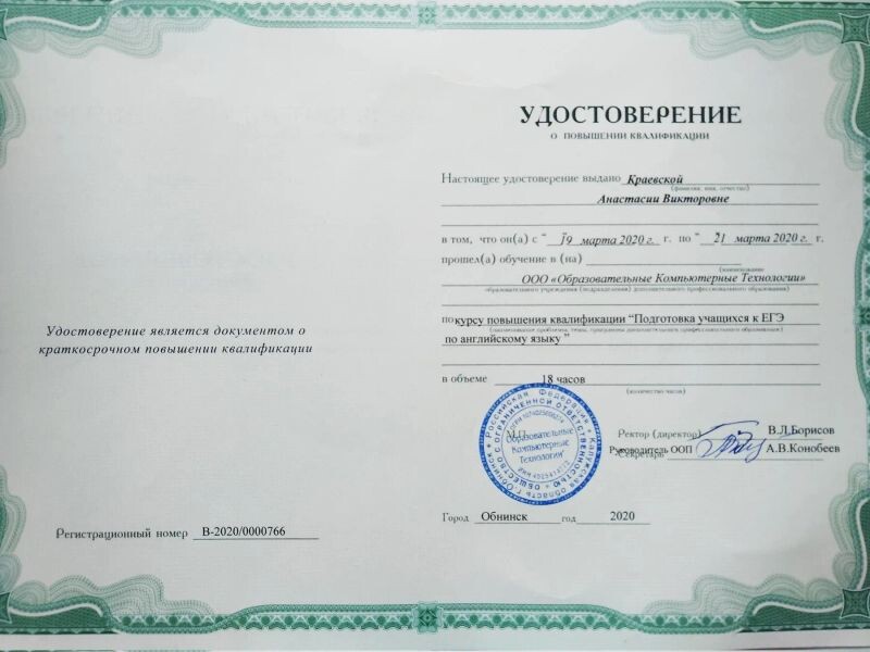 - OOO «Образовательные компьютерные технологии», подготовка учащихся к ЕГЭ по английскому языку, 2020 г.