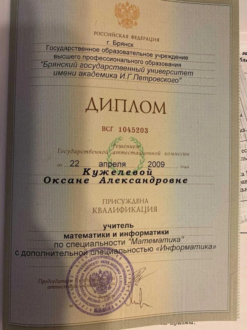 - Образование высшее Брянский Государственный университет, физико-математический факультет, специальность – математика, учитель математики и информатики, 2009 г.