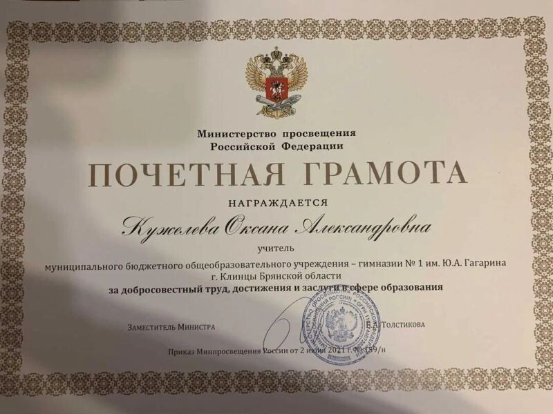 - МПРФ, грамота за добросовестный труд, достижения и заслуги в сфере образования, 2021 г.