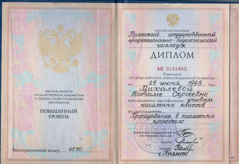 - Брянский профессионально-педагогический колледж, специальность – преподавание в начальной школе, 1994–1998 гг.