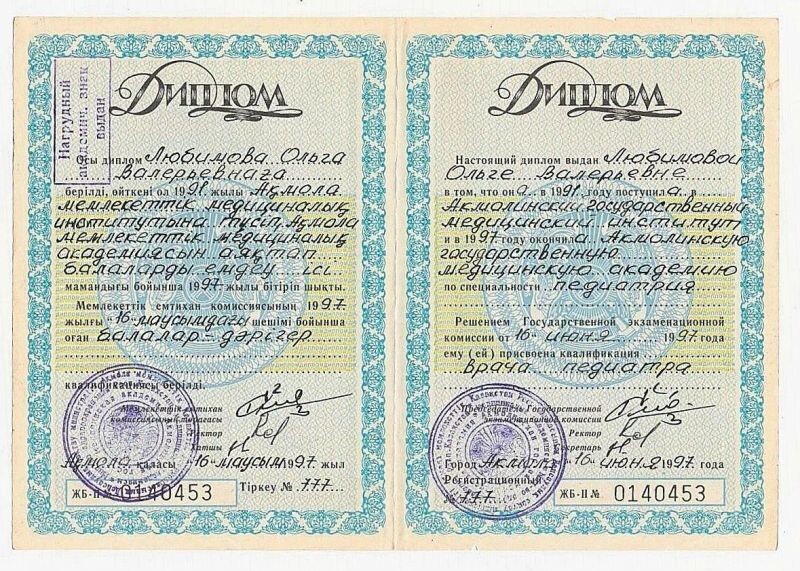 - Акмолинская государственная медицинская академия, педиатрия, 1991–1997 гг.