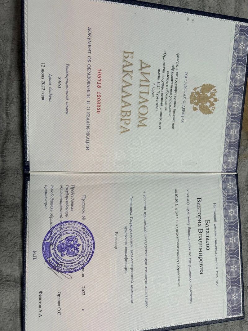 - Орловский государственный университет имени И.С. Тургенева, специальное (дефектологическое) образование, 2018–2022 гг.