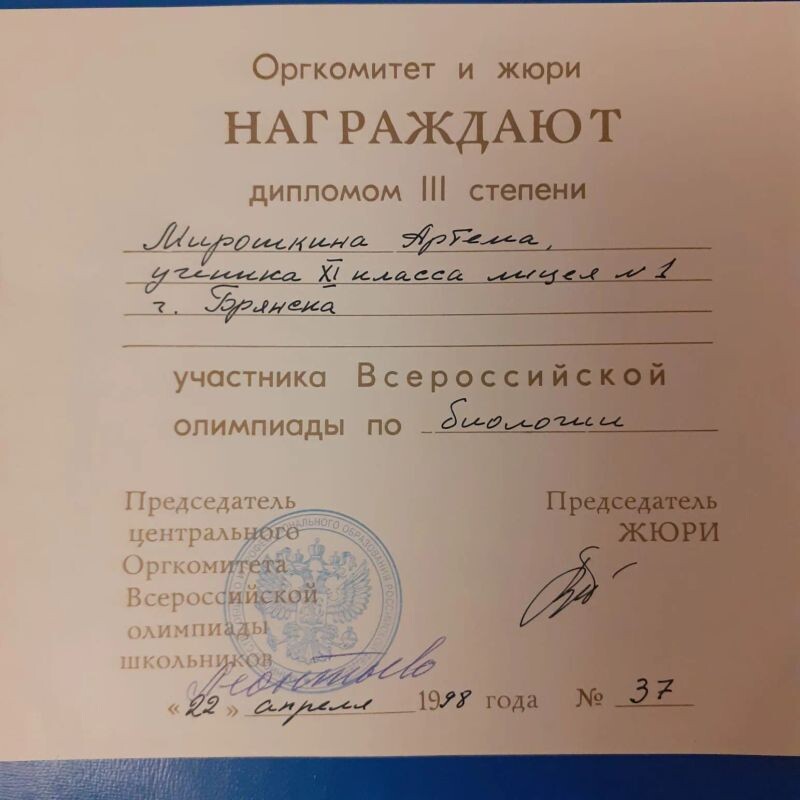 - Диплом участника Всероссийской олимпиады по биологии (с 1998 г.).