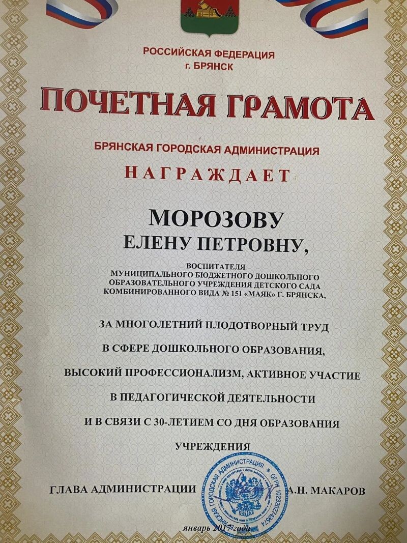 - Почётная грамота Брянской городской администрации за многолетний труд, 2017 г.