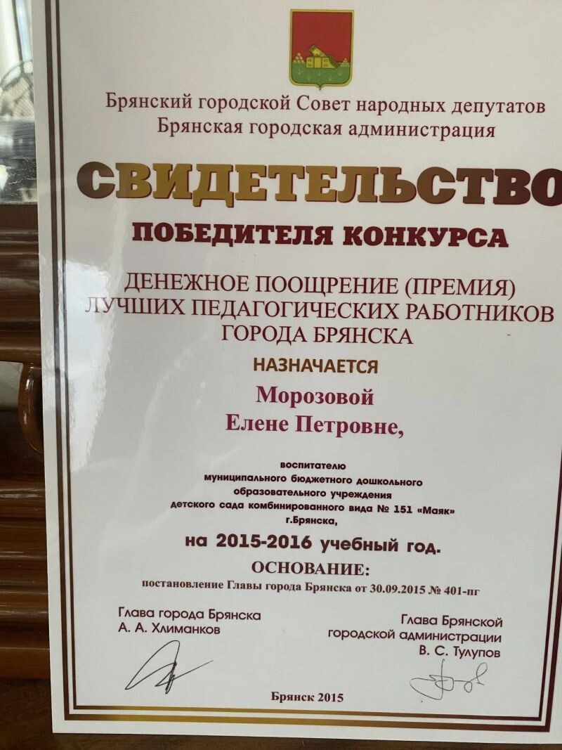 - Брянская городская администрация, свидетельство победителя конкурса лучших педагогических работников, 2015 г.