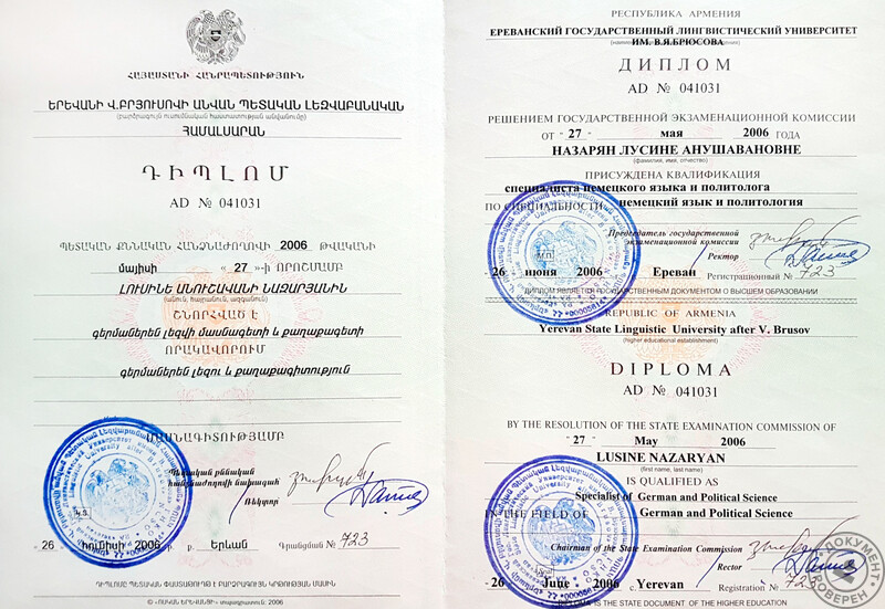 - В 2006 году окончила Ереванский государственный лингвистический университет им. В.Я. Брюсова (Армения), факультет лингвистики и межкультурной коммуникации, направление подготовки – немецкий язык, политология.