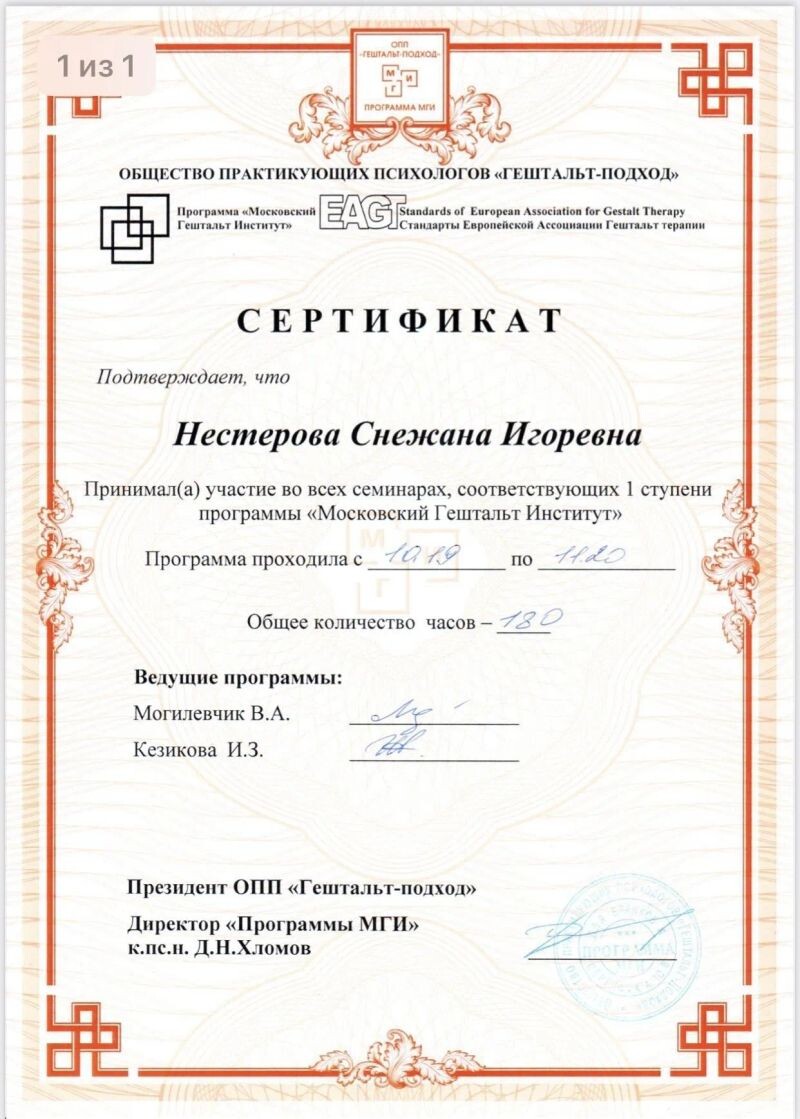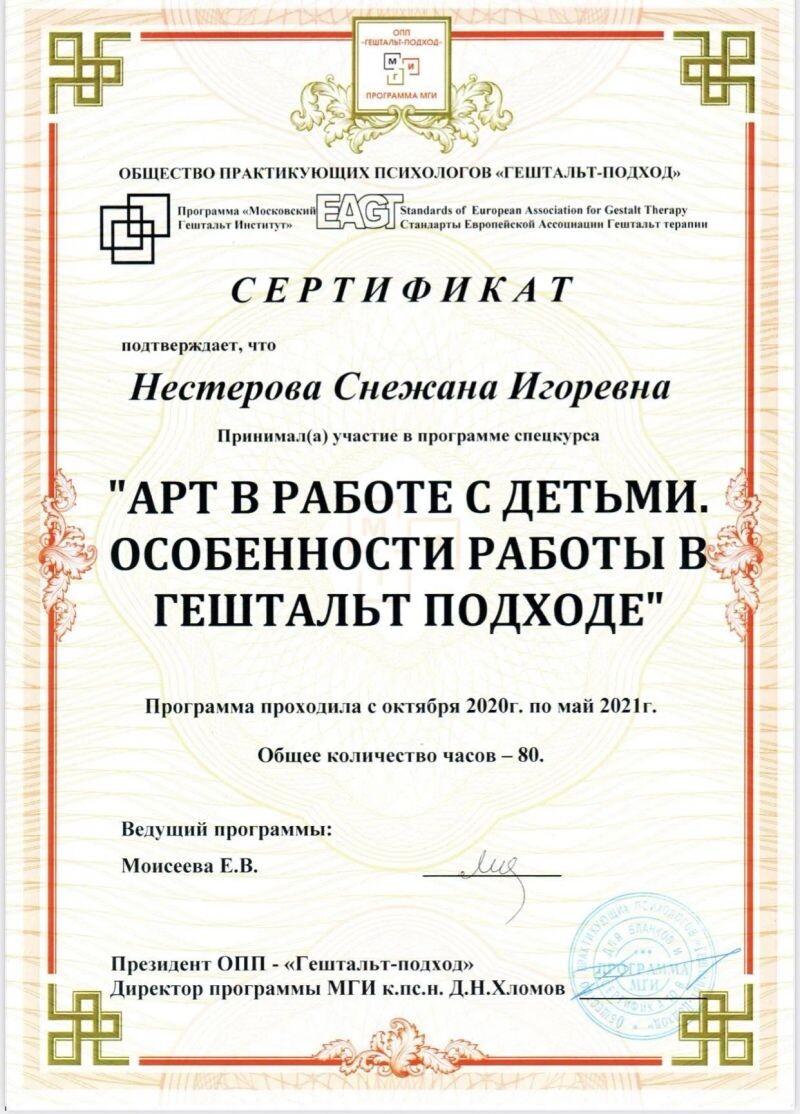 - ООП «Гештальт-подход», обучение по программе «Арт в работе с детьми. Особенности работы в гештальт подходе», 2020–2021 гг.
