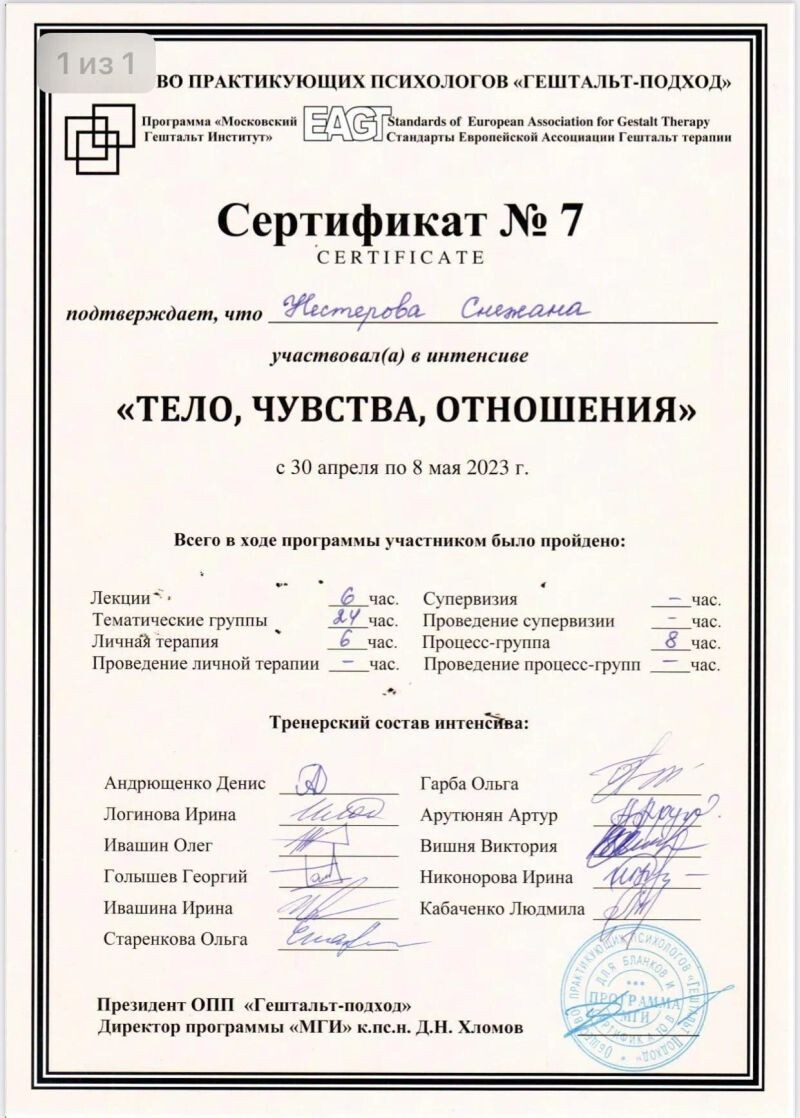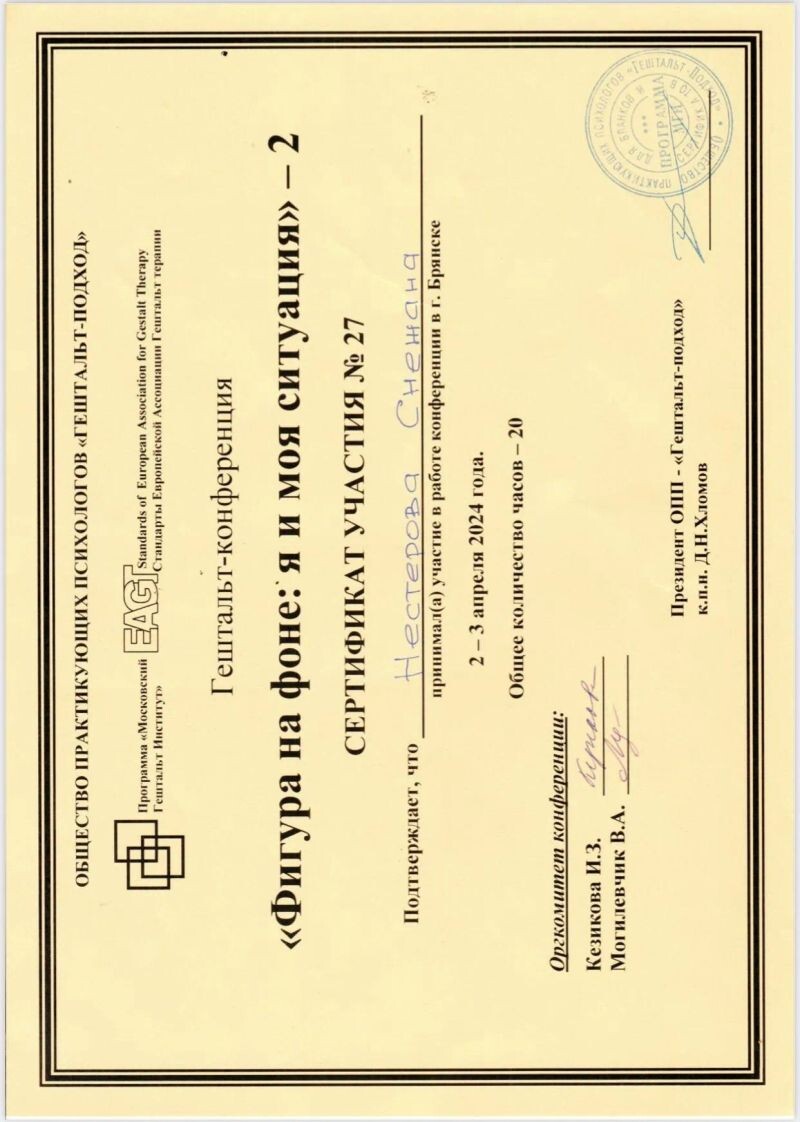 - ООП «Гештальт-подход», обучение по программе «Нейрофизиология травмы. Работа с травмой в модели EMDR и гештальт-подходе», 2024 г.