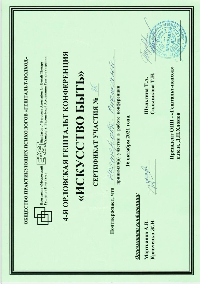 - ООП «Гештальт-подход», 4-я Орловская гГештальт конференции «Искусство быть», 2021 г.