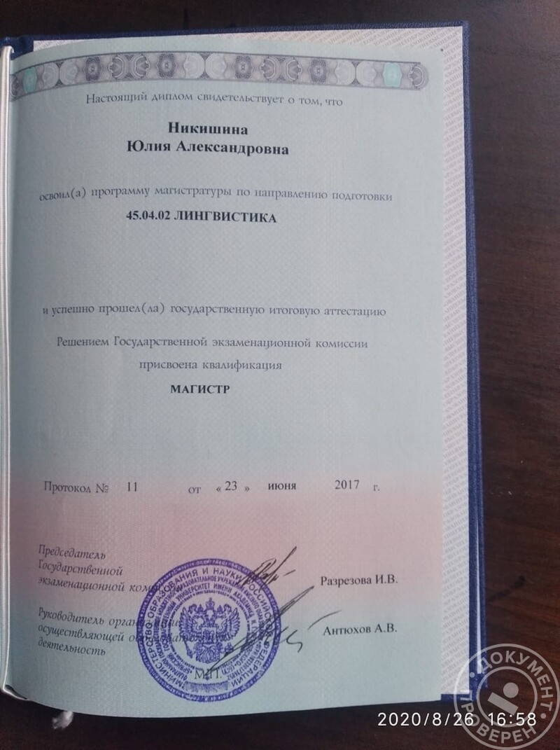 - Магистратура, факультет иностранных языков, специальность – перевод и переводоведение, 2017 г.