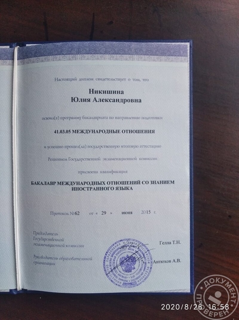 - Брянский государственный университет им. академика И.Г. Петровского, факультет истории и международных отношений, бакалавр международных отношений, 2015 г.