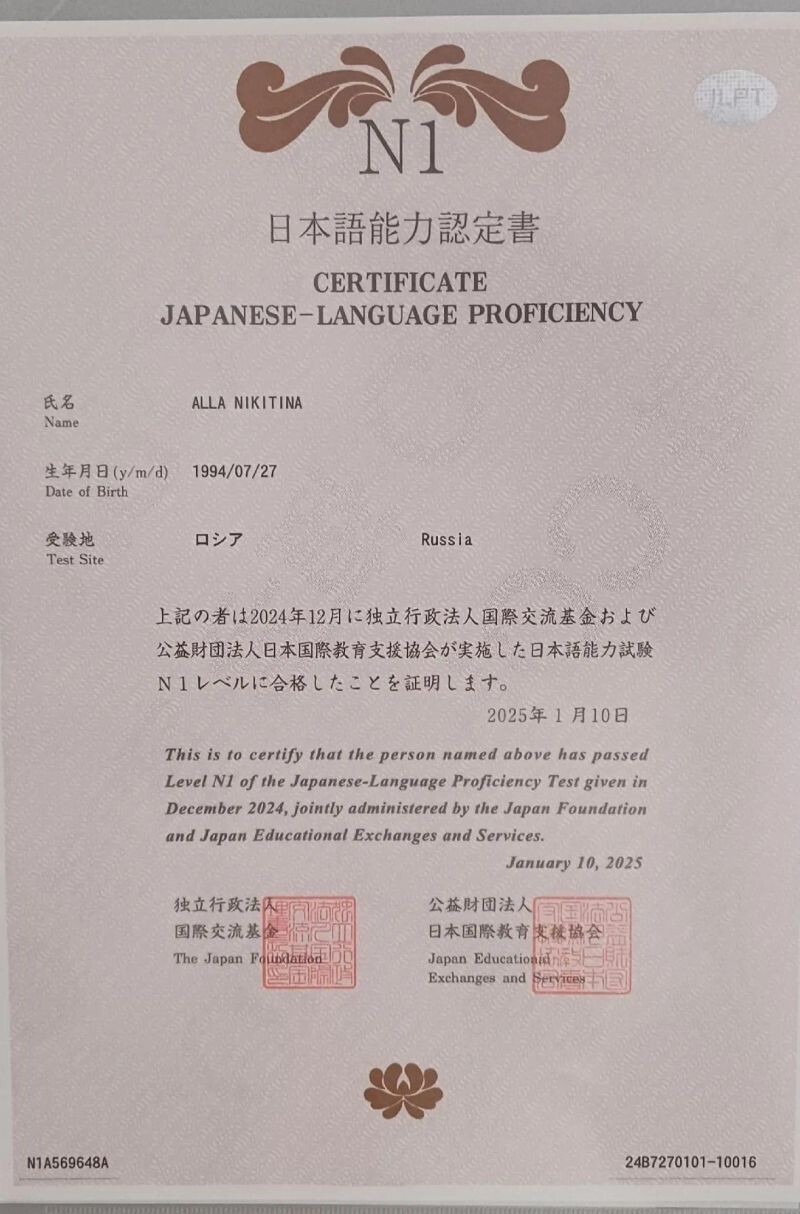 - Сертификат 日本語能力試験N1, 2024 г.