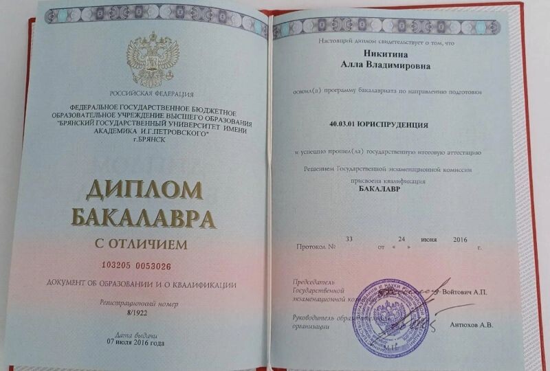 - Брянский государственный университет им. академика И.Г. Петровского, юриспруденция, бакалавриат, 2012–2016 гг.