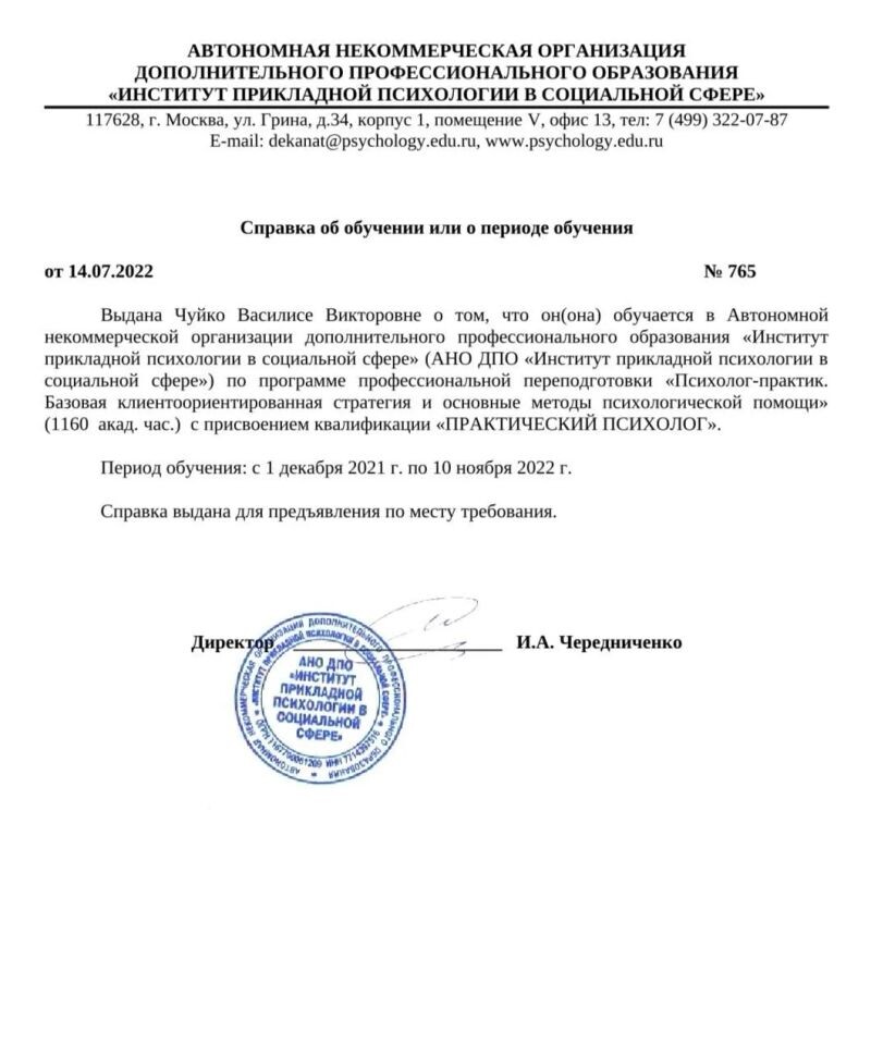 - АНО ДПО «Институт прикладной психологии в социальной сфере», психолог-практик (с 2021 г.).