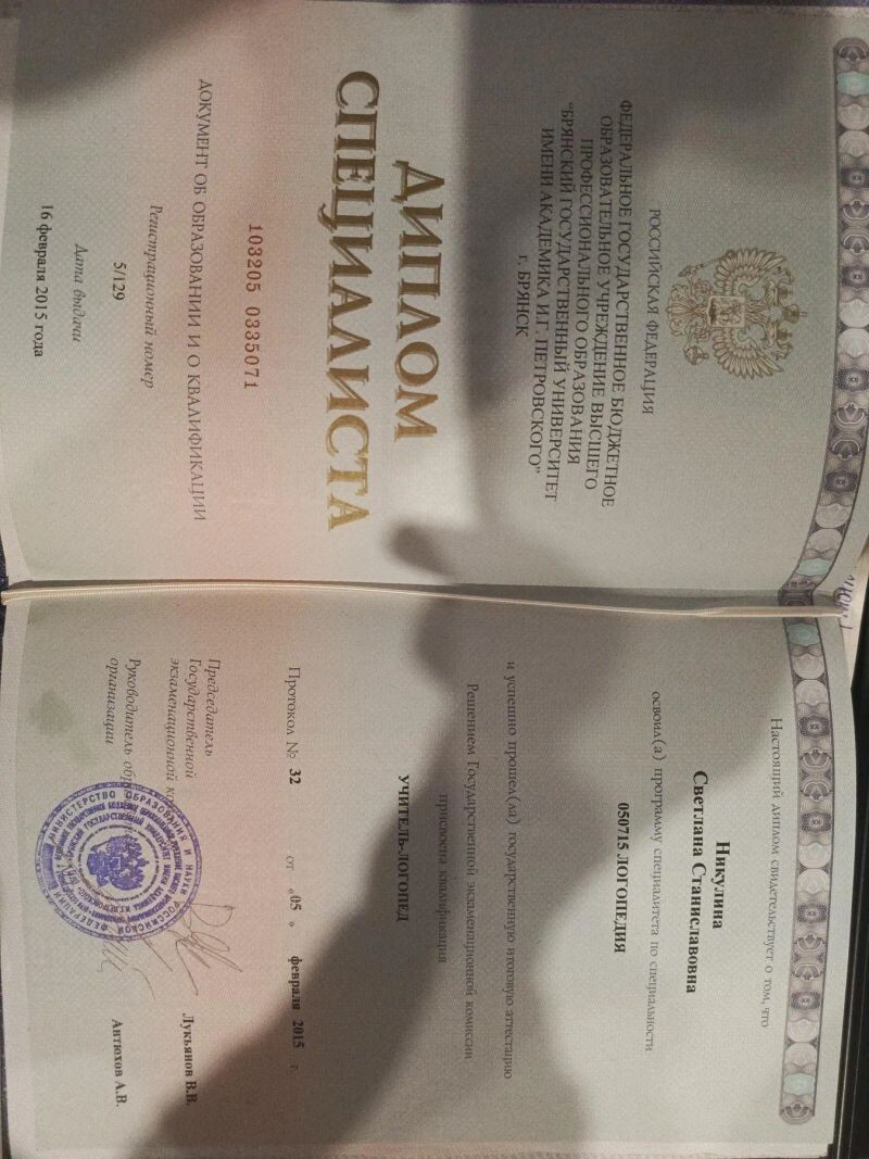 - ФГБОУ ВПО «Брянский государственный университет имени академика И.Г. Петровского», социально-педагогический факультет, учитель-логопед, 2009–2015 гг.