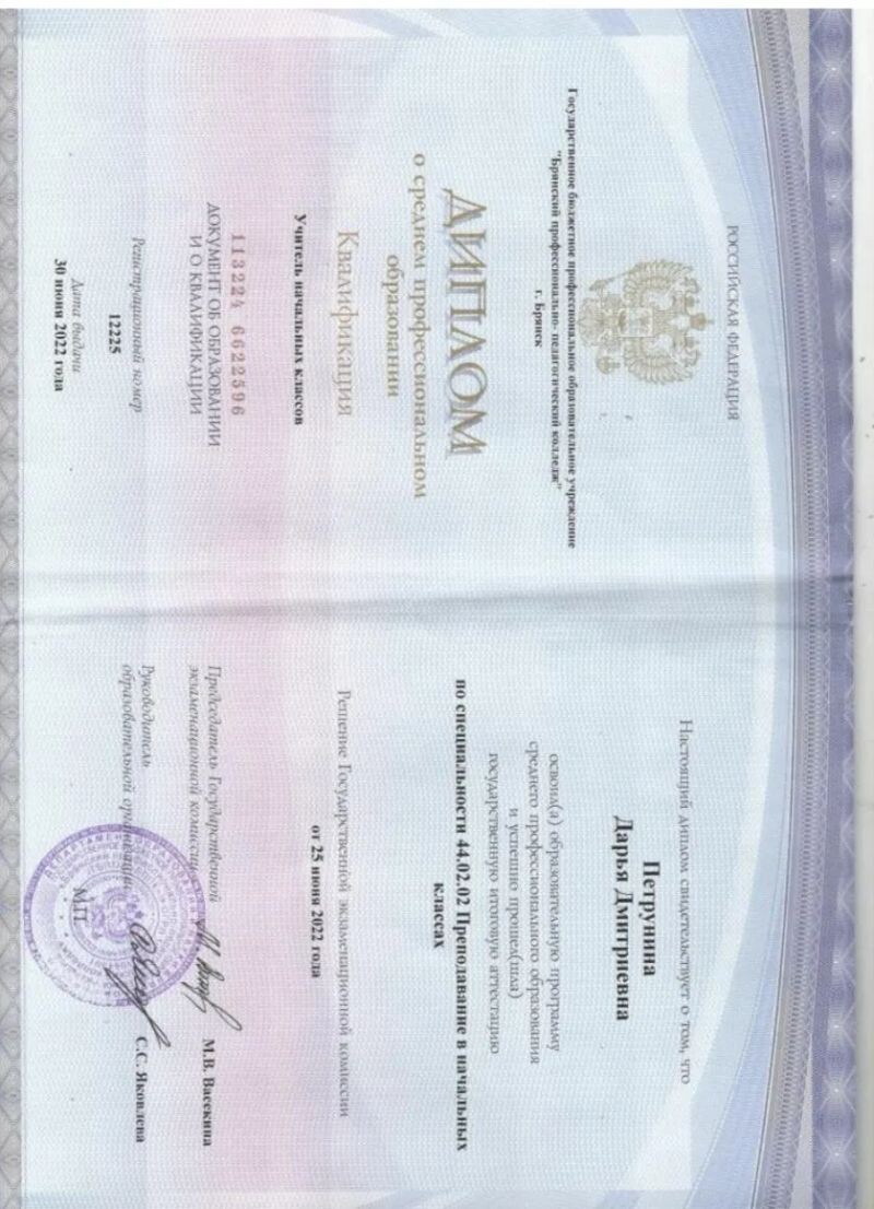 - Брянский профессионально-педагогический колледж, преподавание в начальных классах, 2018–2022 гг.