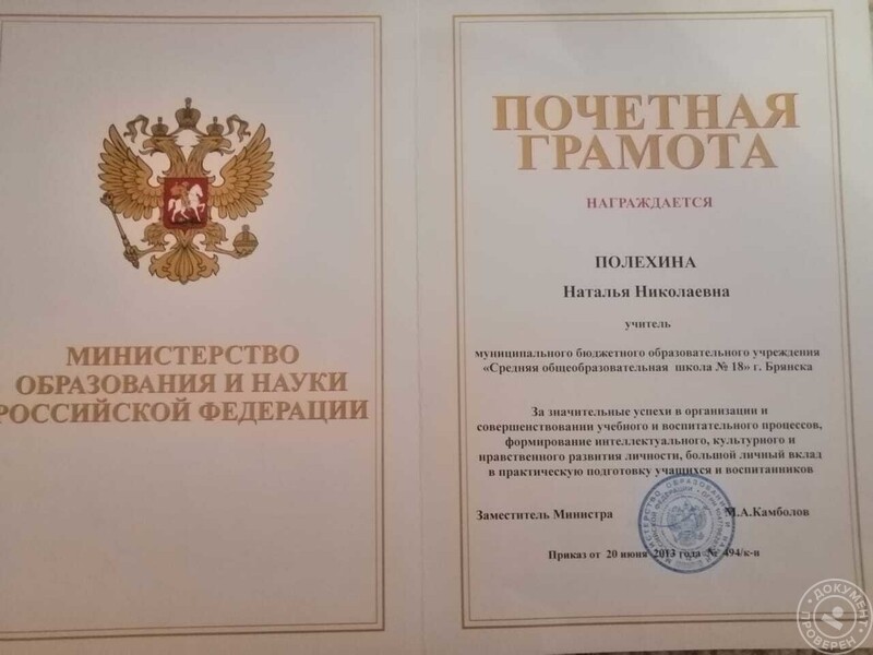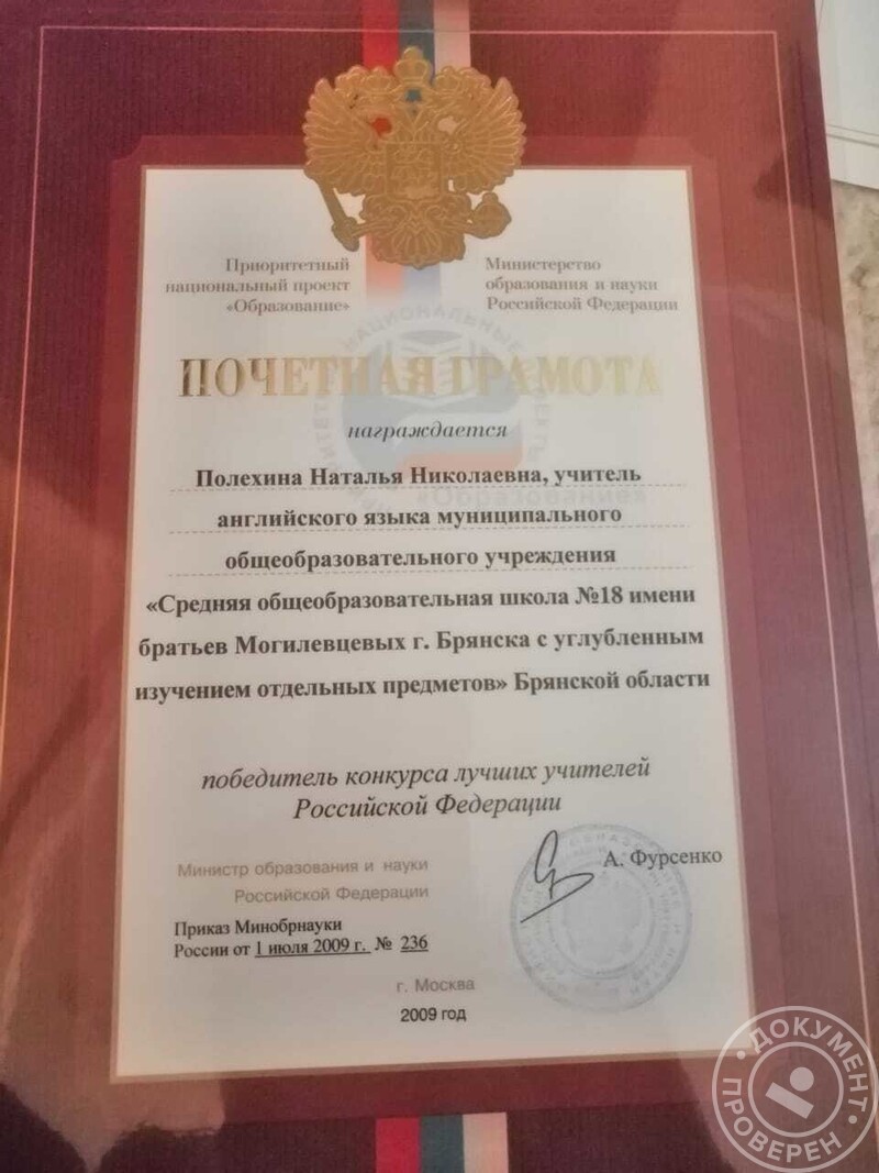 - Грамота победителя конкурса лучших учителей РФ, 2009 г.