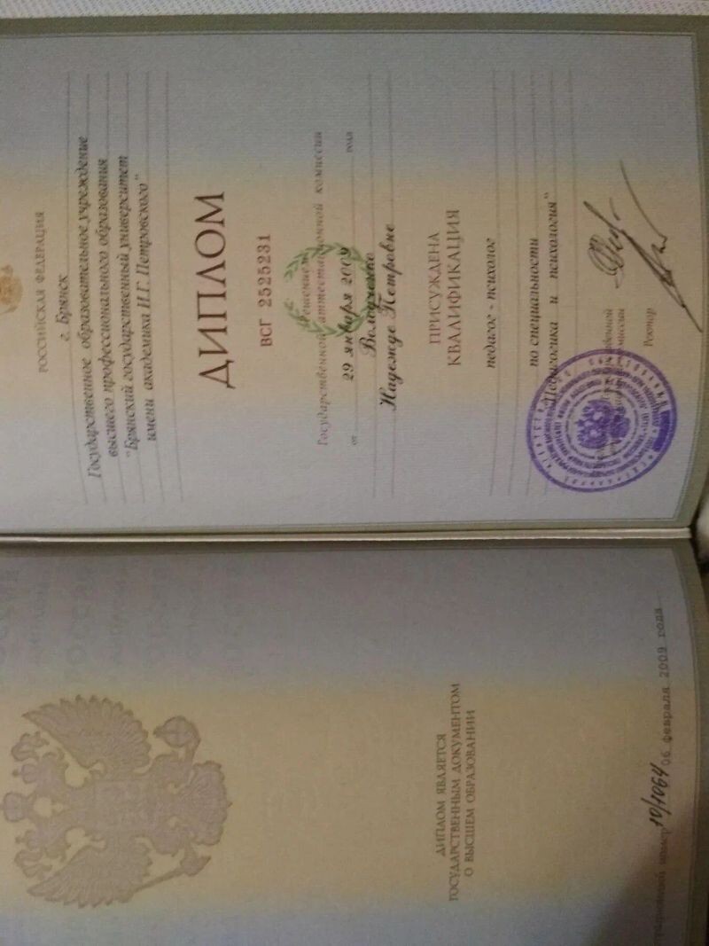 - Брянский государственный университет им. И. Г. Петровского, педагог - психолог, 2005–2009 гг.